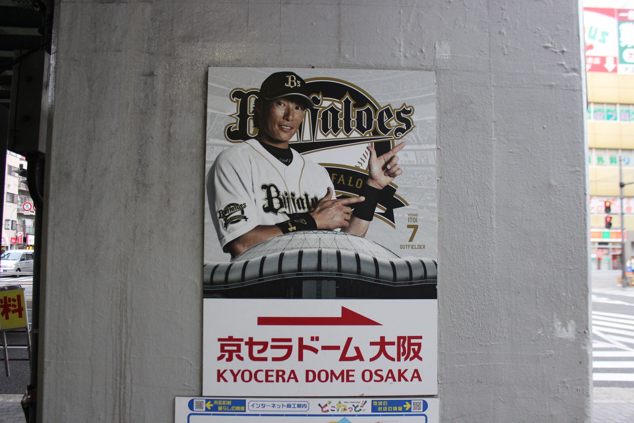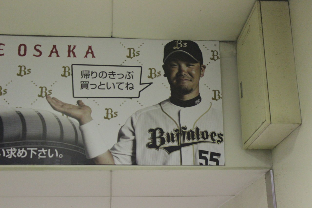 こちら側は京セラドーム大阪に近い側。JRではこちら側が最寄りということになります。歩いて5分程度。駅構内や駅前にはオリックス・バファローズの選手が営業用スマイルを浮かべ球場へ観客を誘導しています。