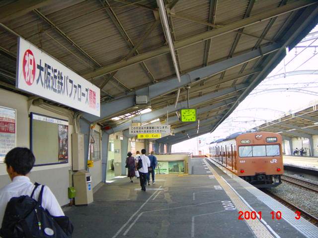 この年、当駅最寄りの大阪ドームを本拠地としている大阪近鉄バファローズがリーグ優勝を成し遂げましたが、それを祝う横断看板がホームに掲出されましたが、よく考えたら同業他社グループの企業慶事を祝うのに違和感を覚えるのは鉄道マニアだけ?!