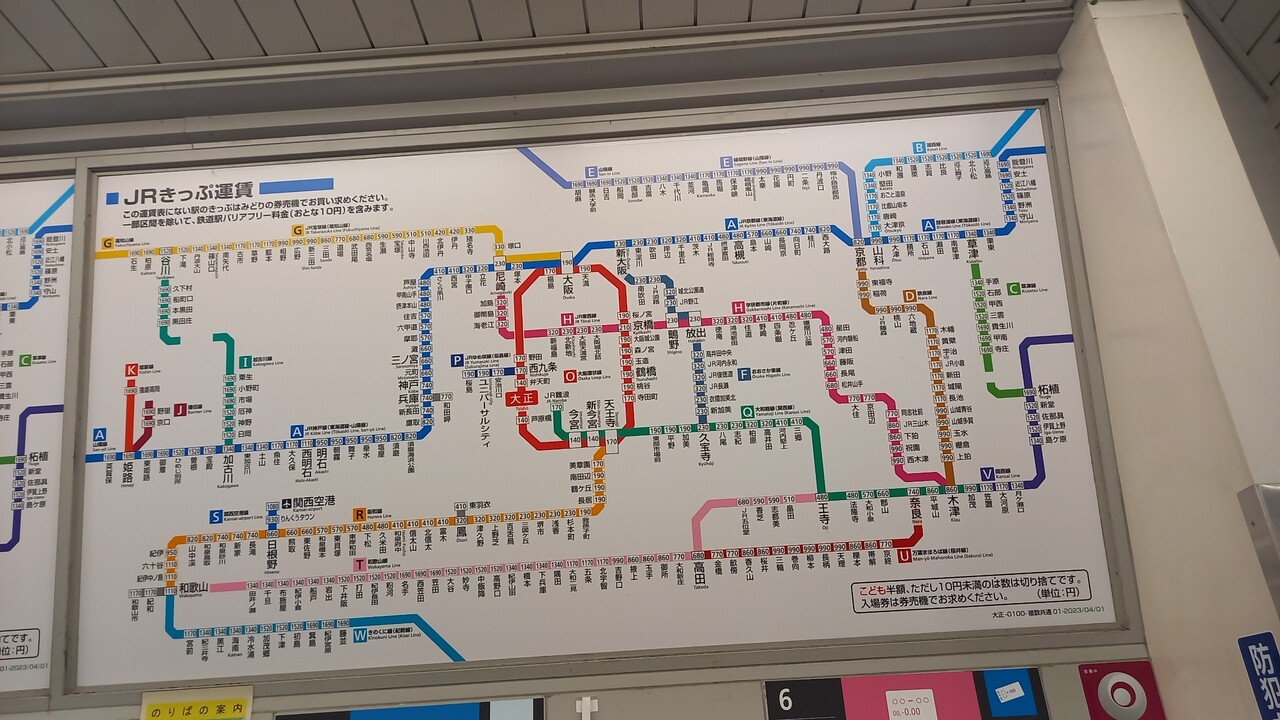 運賃表です。大阪駅までは190円、新大阪駅までは230円、三ノ宮駅までは460円となっています。