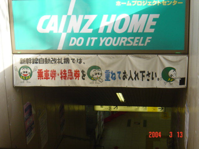 新幹線のりばに掲げられていた横断幕です。高崎名物のだるま弁当をモチーフにしたキャラクターが自動改札機の使い方を指南しています。