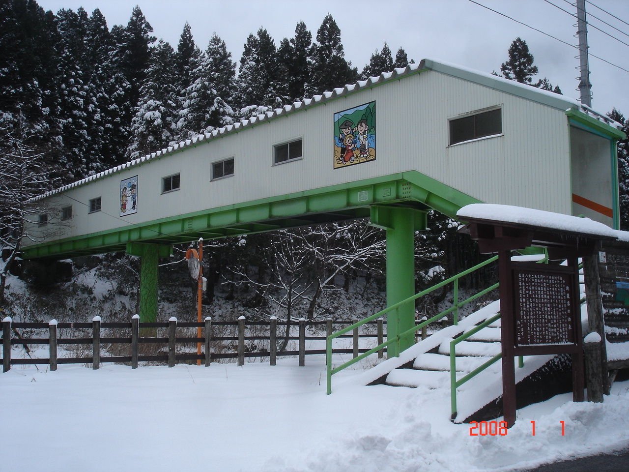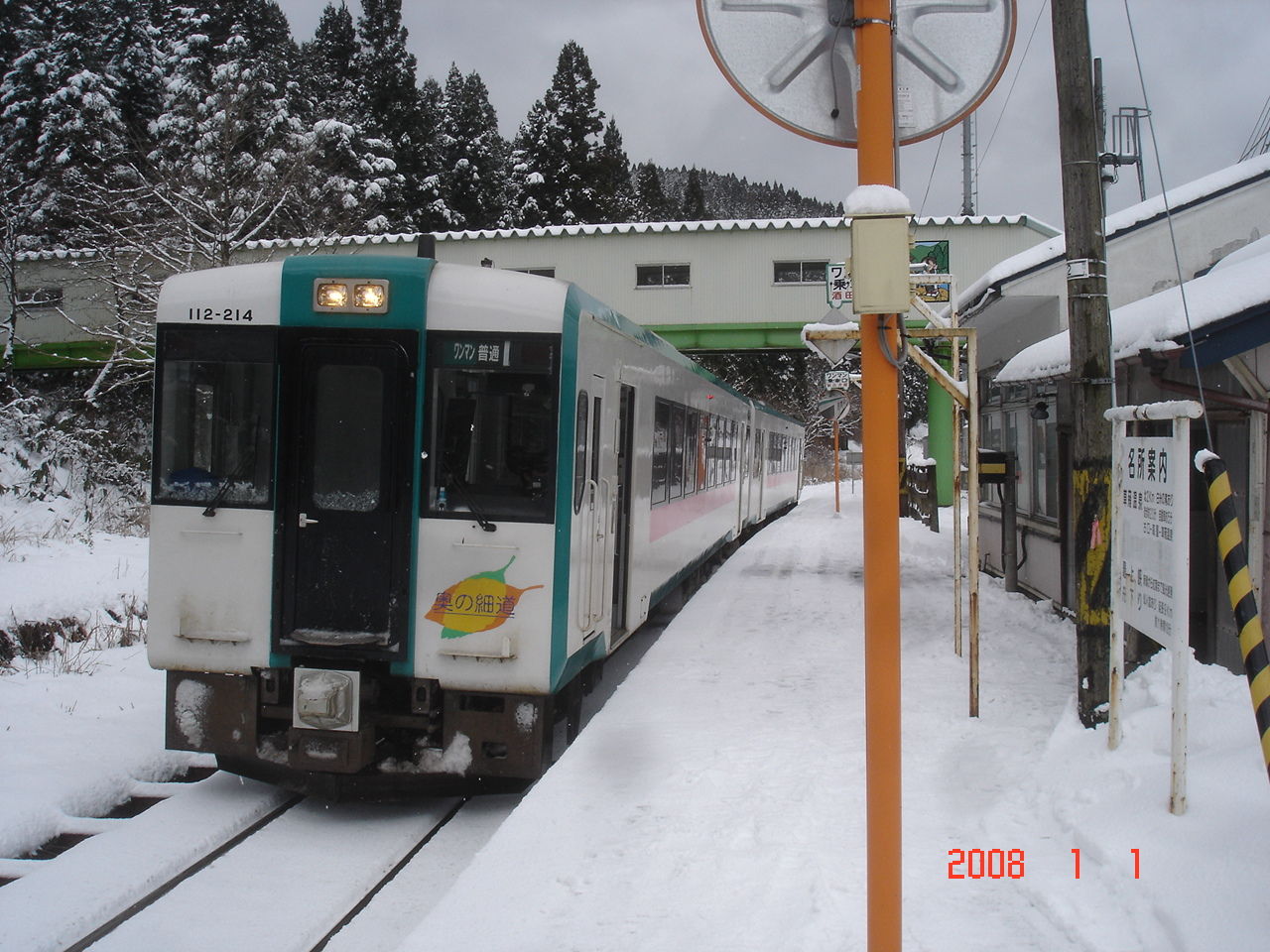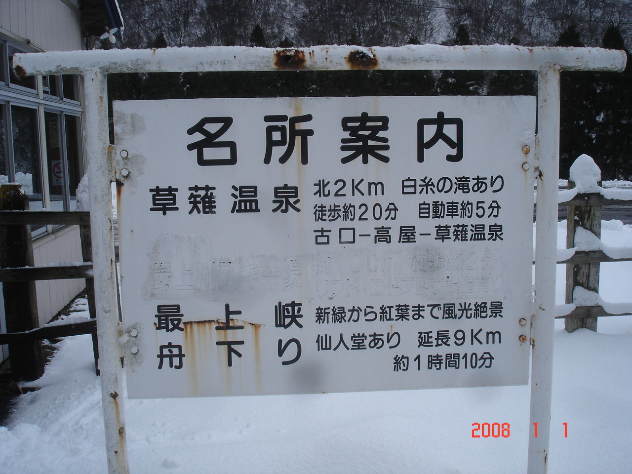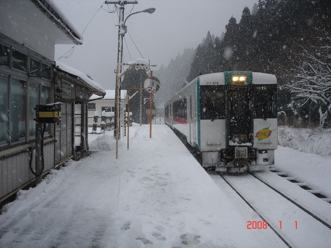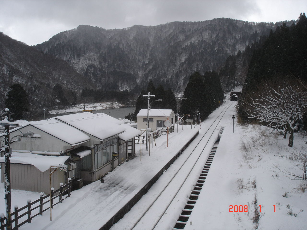 最上川を見渡すことが出来る高台に設置された駅です。2008年1月に訪問した際は旧駅舎が残存されていました。味がある木造駅舎ですが、現在はこの駅舎が撤去された跡地に小さな待合室が設置されています。津谷駅同様、旧駅舎の一部が倉庫として切り取られてそのまま残されているので、近いうちにその様子を見に行きたいなと。