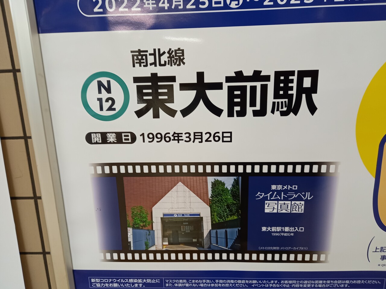 東京メトロ全線デジタルスタンプラリー階催事掲示のポスターに出ている1番出入口の様子です。南北線は比較的新しい路線につき、看板類が営団仕様となっている点以外、今とほとんど変化はありませんな。