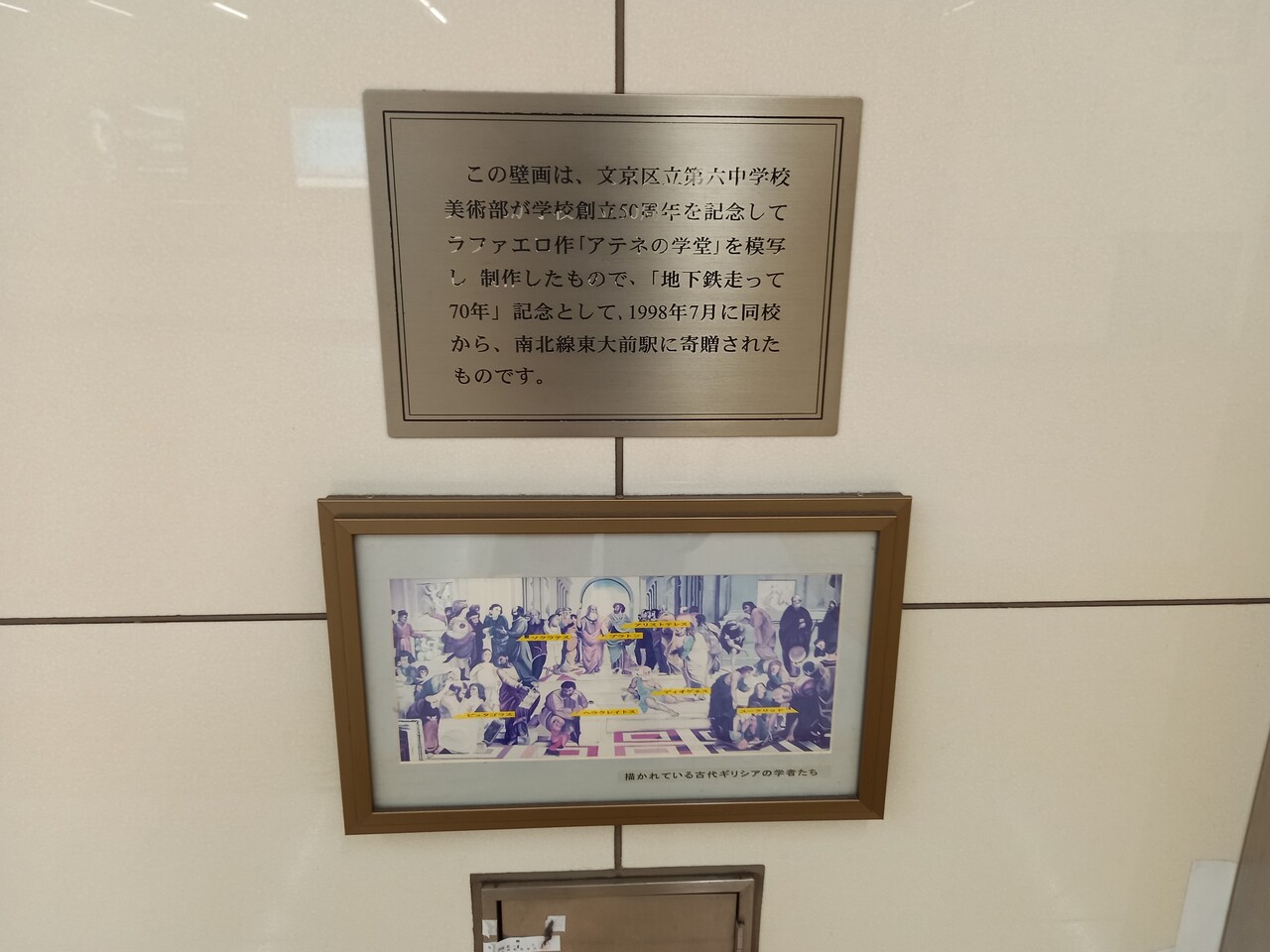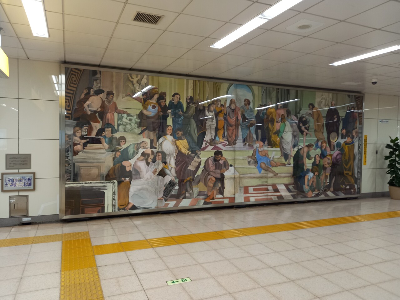 地下に降りると巨大な壁画が目を引きます。ローマ教皇ユリウス2世の依頼により 1508~10年に制作されたラファエロの最大傑作で、バチカン宮殿「署名の間」を飾る名画がなぜ当駅のコンコースに?!と思ってよく見ると・・・