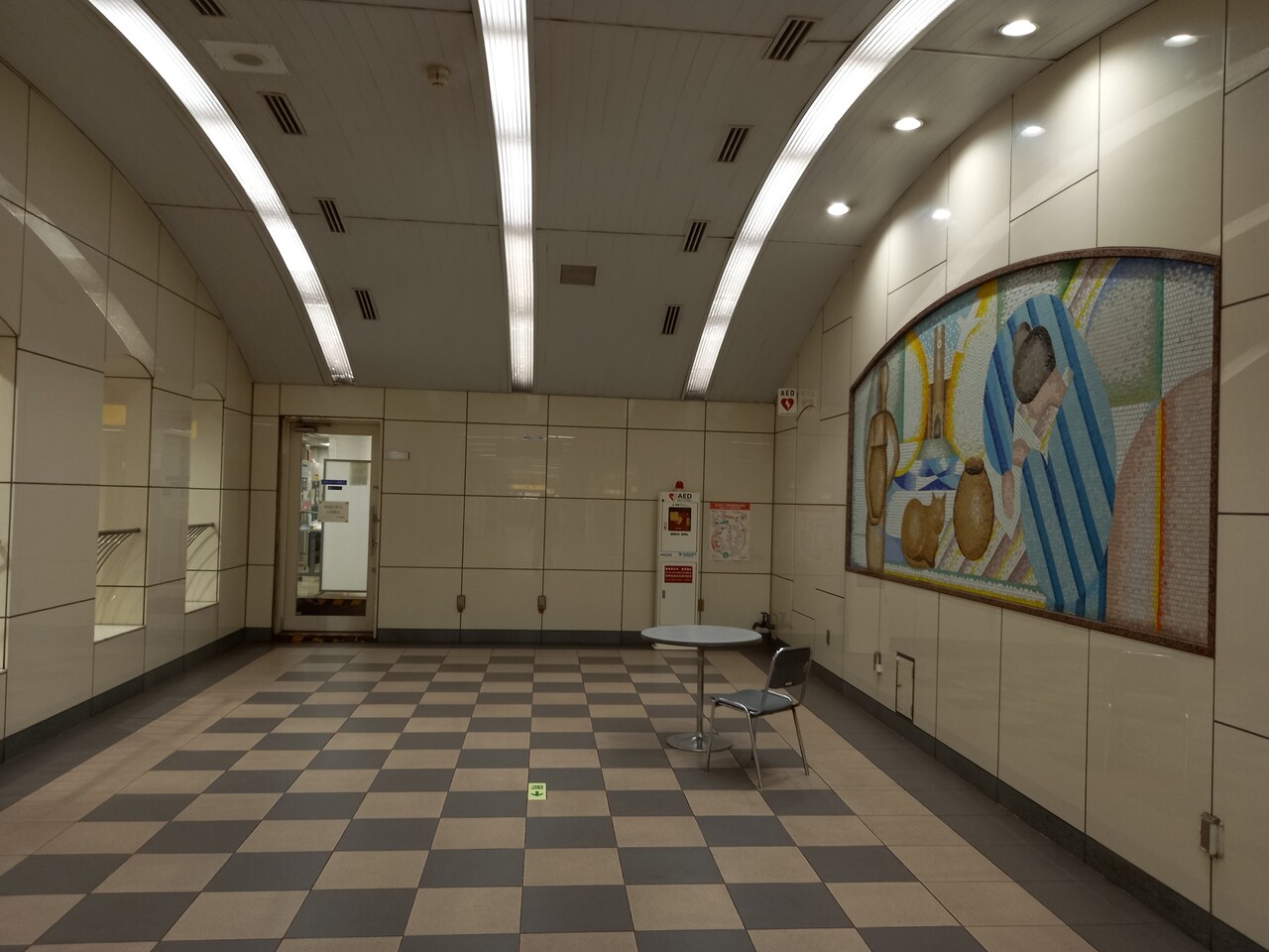 同じフロアの駅事務室前にも絵画作品が掲示されていて、その前には待ち合わせにちょうどよさげなテーブルと椅子が用意されています。