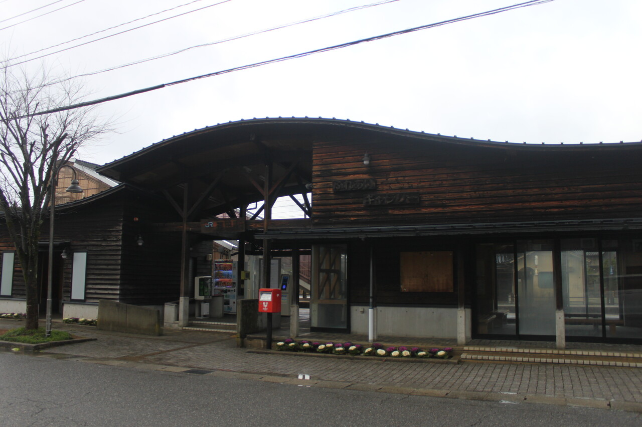 平成10(1998)年竣工の駅舎建物は地元の「ふれあいギャラリー」との合築構造となっています。木材をふんだんに用いた構造となっています。