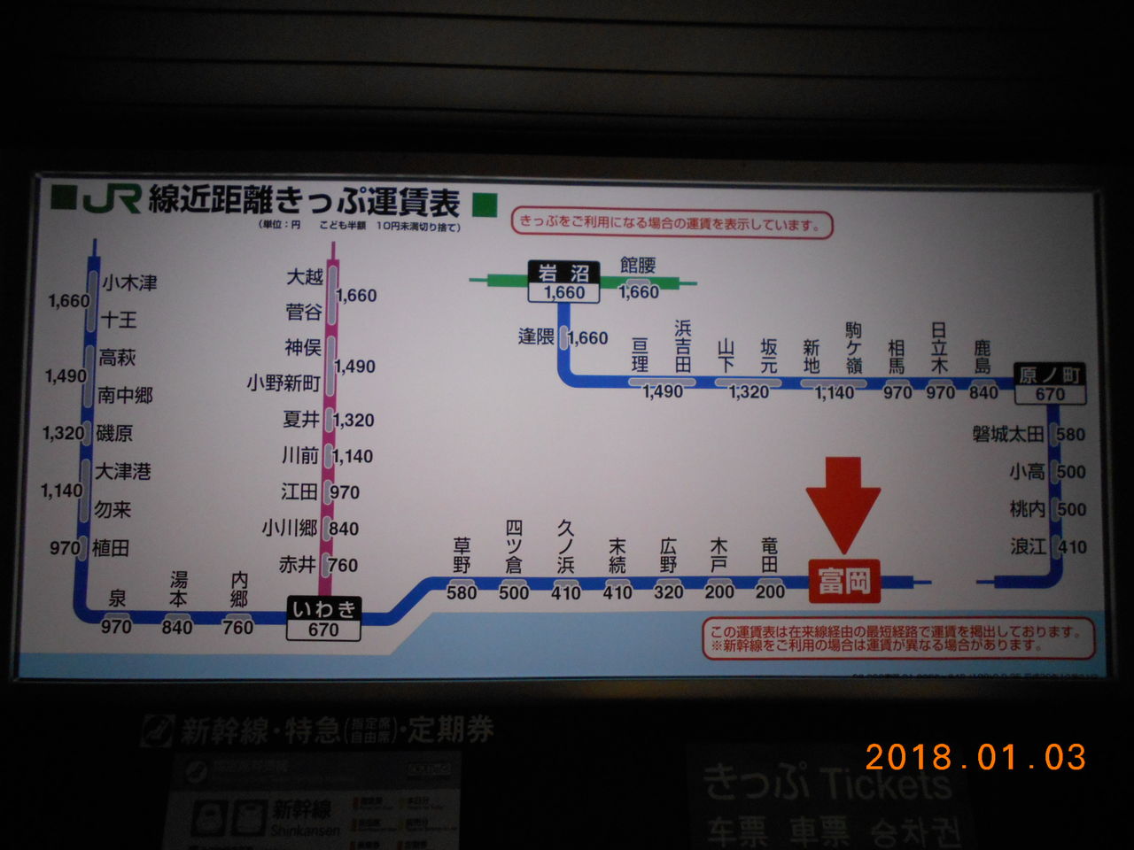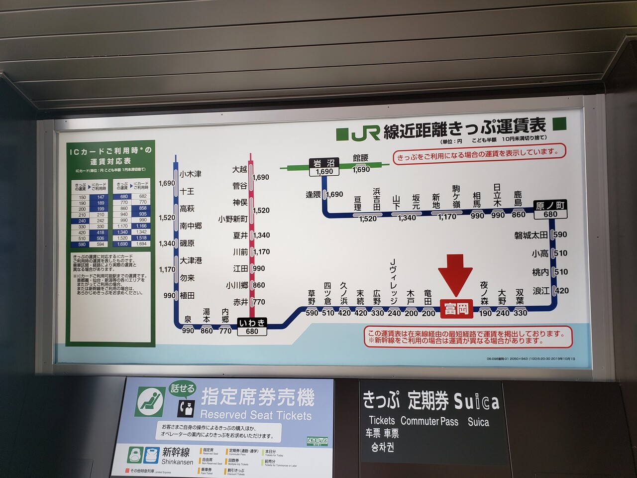 券売機の頭上には運賃表が掲示されています。以前確認した時と異なり当駅以東と繋がっていて、全線復旧を強く印象付けてくれます。