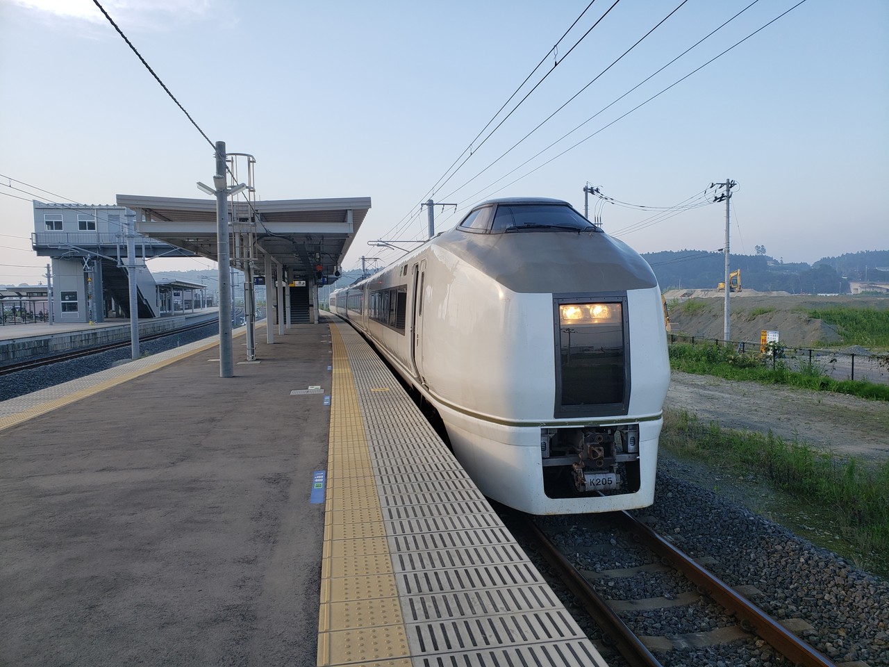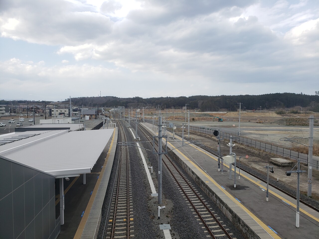 跨線橋から駅構内を見た図です。右側に広がる部分は工事中の更地です。事業が進むと防災のため植林が行われ災害防災林が形成されるんだそうです。