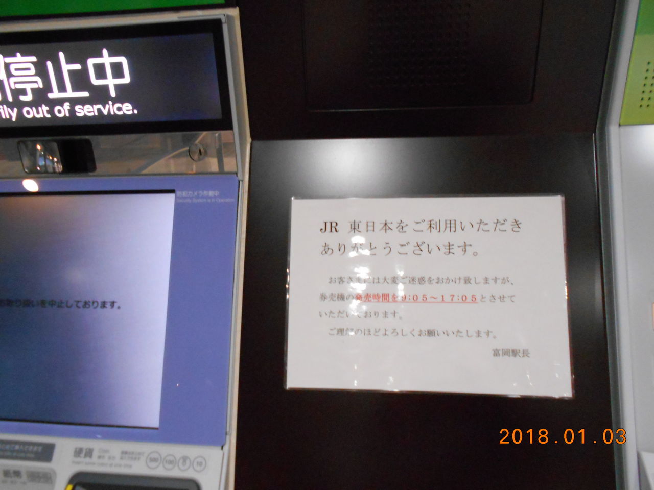 当駅にはみどりの窓口は設置されていないかわりに指定席券売機が設置されていますが、稼働時間が9時05分から17時05分までとなっていて、それ以外の時間帯は乗車券類の購入が出来ませんでした(2020年3月14日以降は変更されています)。