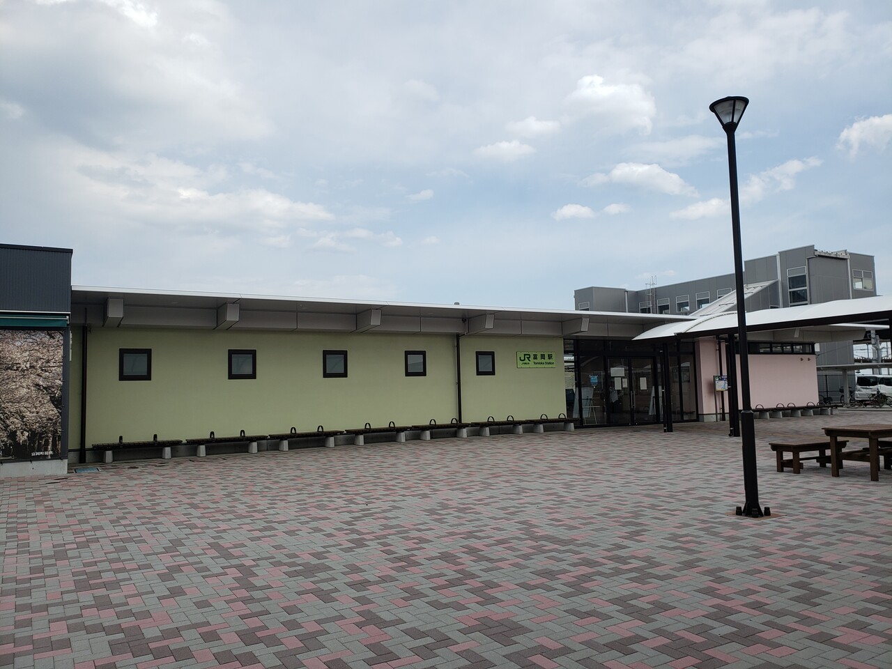 駅前広場には公衆トイレが設けられています。町章と町の木(桜)があしらわれている壁面。この富岡町章、よく見ると「トミオカ」の頭文字が3つ並んでいることがわかります。なかなか洒落が効いているこのデザインは1955年に制定されたものなんだそうです。
