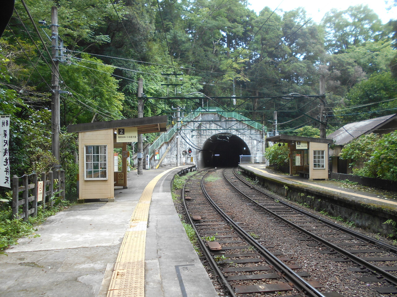 出入口は1番(強羅方面)ホームに面していて、箱根湯本方面の2番ホームは跨線橋を横断します。