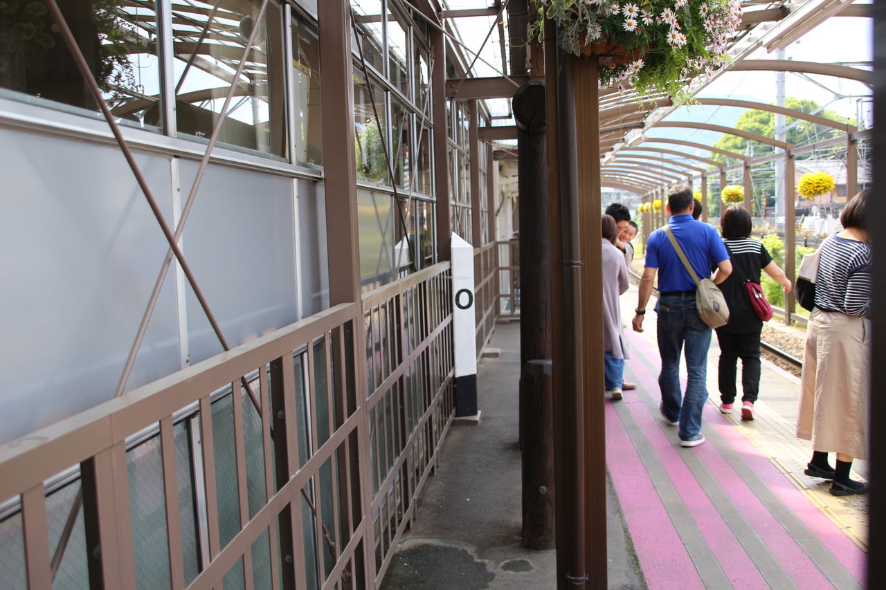 このような状況になり、列車進入時はかなり危険ですが、そこは関西の風情。ホームの係員さんが「列車撮影で命を落としたら面白くありませんのでご注意くださ~い」とアナウンスし和やかな雰囲気が流れます。