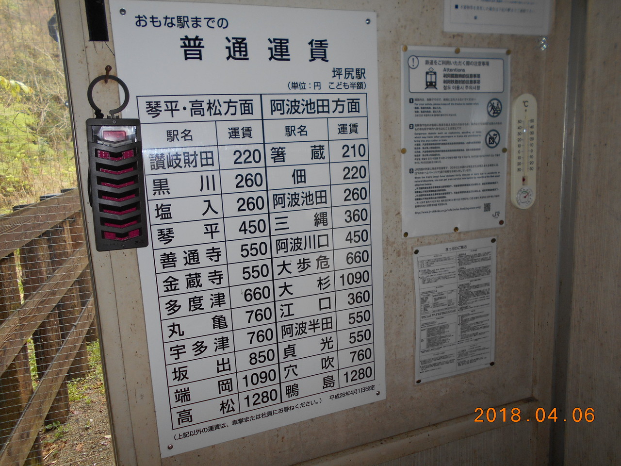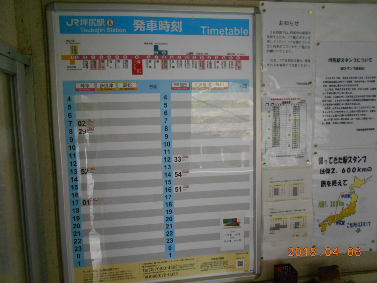 待合室内に掲示されている停車列車時刻表です。プラットホームが本線上に無い配線設備の都合から、当駅を通過する普通列車も設定されています。この時刻表の他に通過列車が記載されている時刻表も別掲されています(当駅に限らずJR四国の駅には通過時刻表が設置されていることは多いです)。