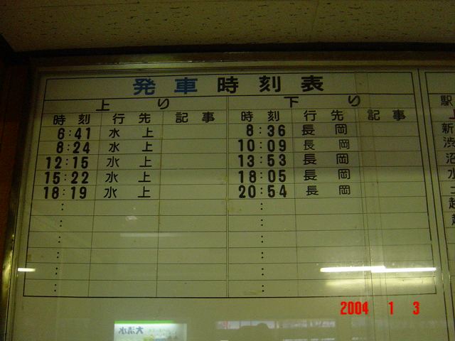 訪問した2004年1月現在の停車列車はこんな感じ。上りの水上行も下りの長岡行も5本ずつしかありません。この記事を編集している2017年夏のダイヤと照らし合わせると細かい発車時刻は異なっていますが設定されている列車の発車時刻は概ね変りません。