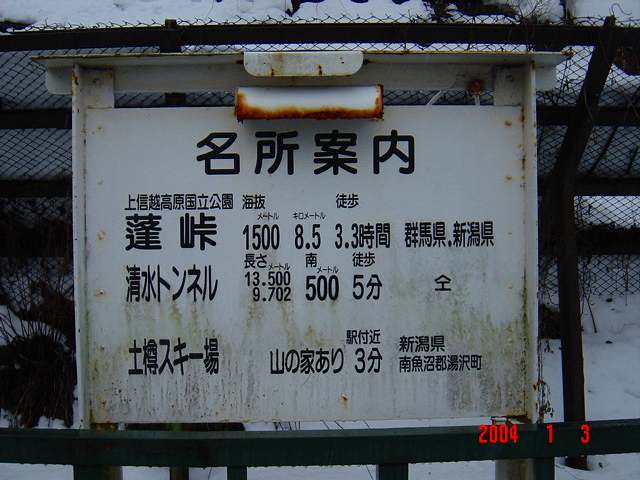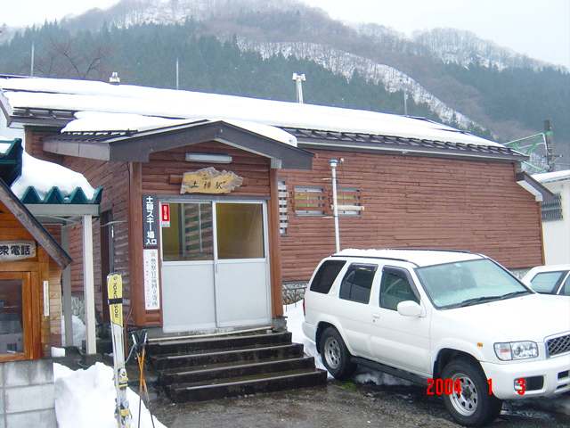 木造の小さな駅舎がある駅です。2004年訪問時、駅舎出入口脇には「土樽スキー場入口」のかけ看板がありました。
