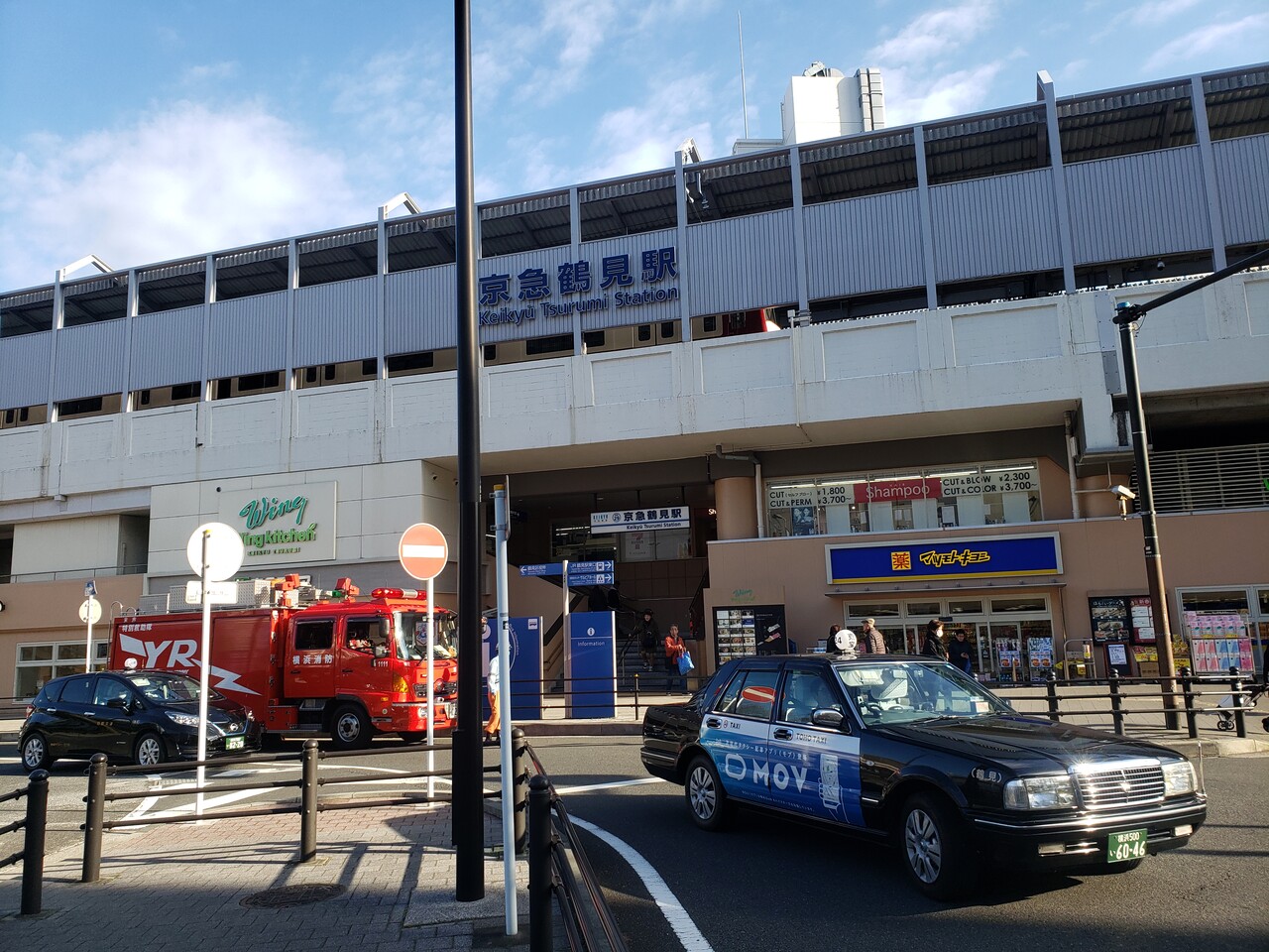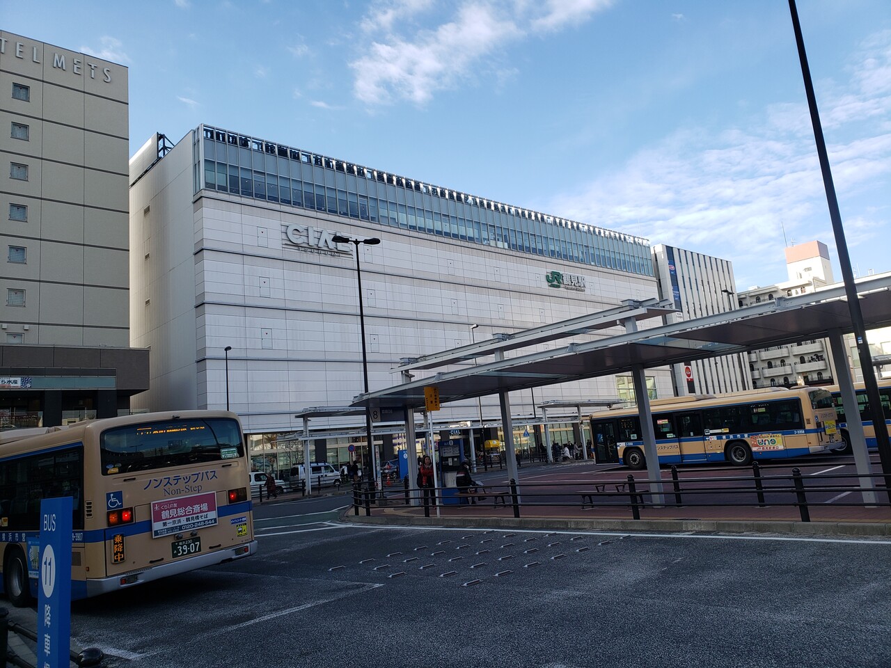 横浜市鶴見区の中心駅です。駅舎の建物は巨大な駅ビル(CIAL鶴見)に内包されています。こちらは東口で、バスターミナルロータリーを挟んだ反対側には、、、