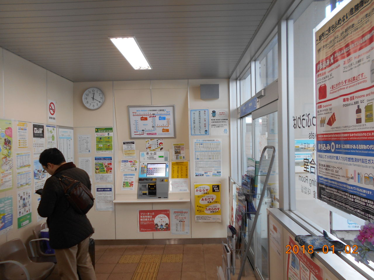 待合室内には多機能型自動券売機が設置されています。この券売機には定期券発行機能は付与されていません。