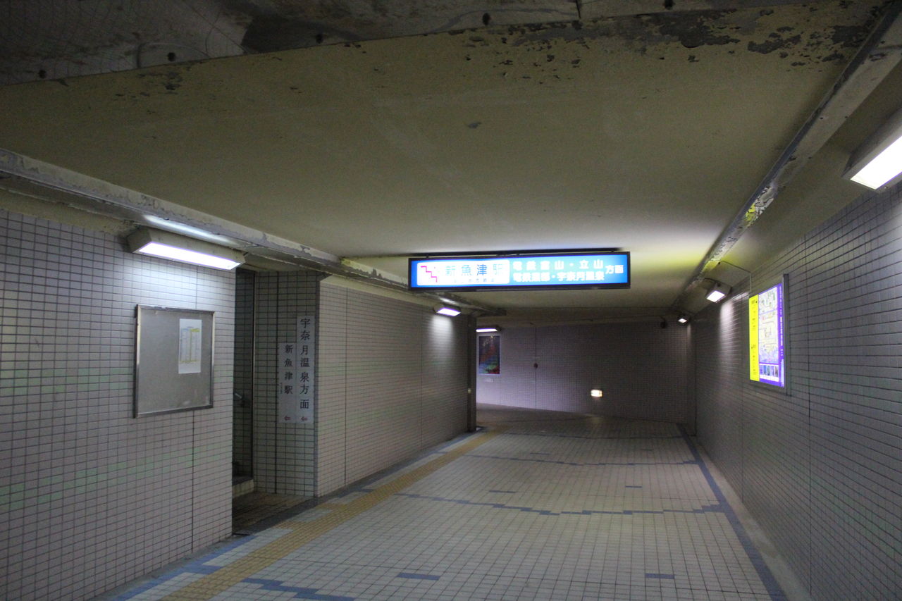 あいの風とやま鉄道(旧JR)駅舎の片隅から地下道へ降り、しばらく歩くと地鉄のりばへの狭い階段を見つけることができます。ここの階段をあがると…