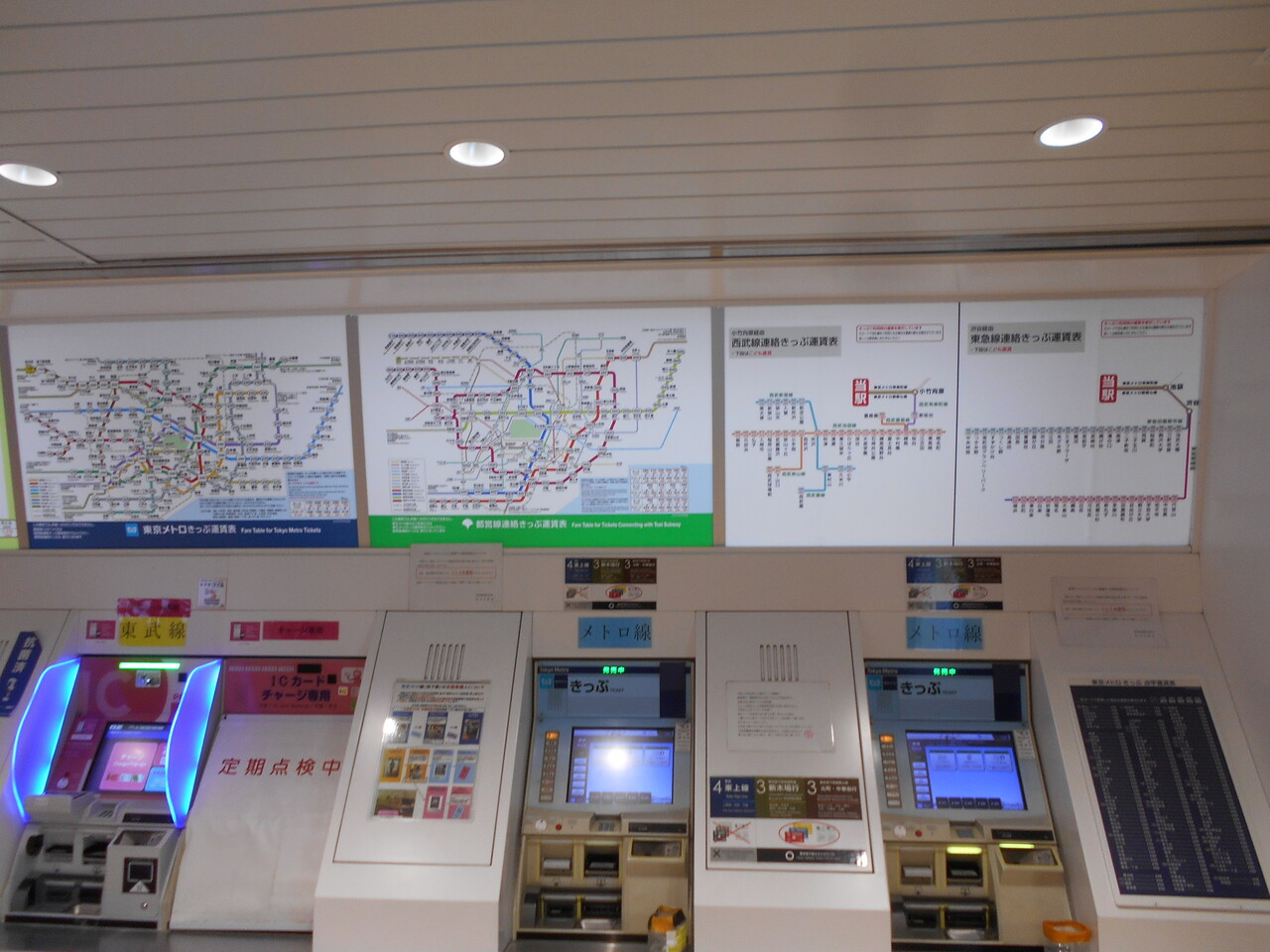 券売機は東武用と東京メトロ用とで別れて設置されています。他社管理の東京メトロ駅に共通していて東京メトロ用券売機ではチャージは受け付けていません。当駅の場合は東武用券売機でチャージができます。