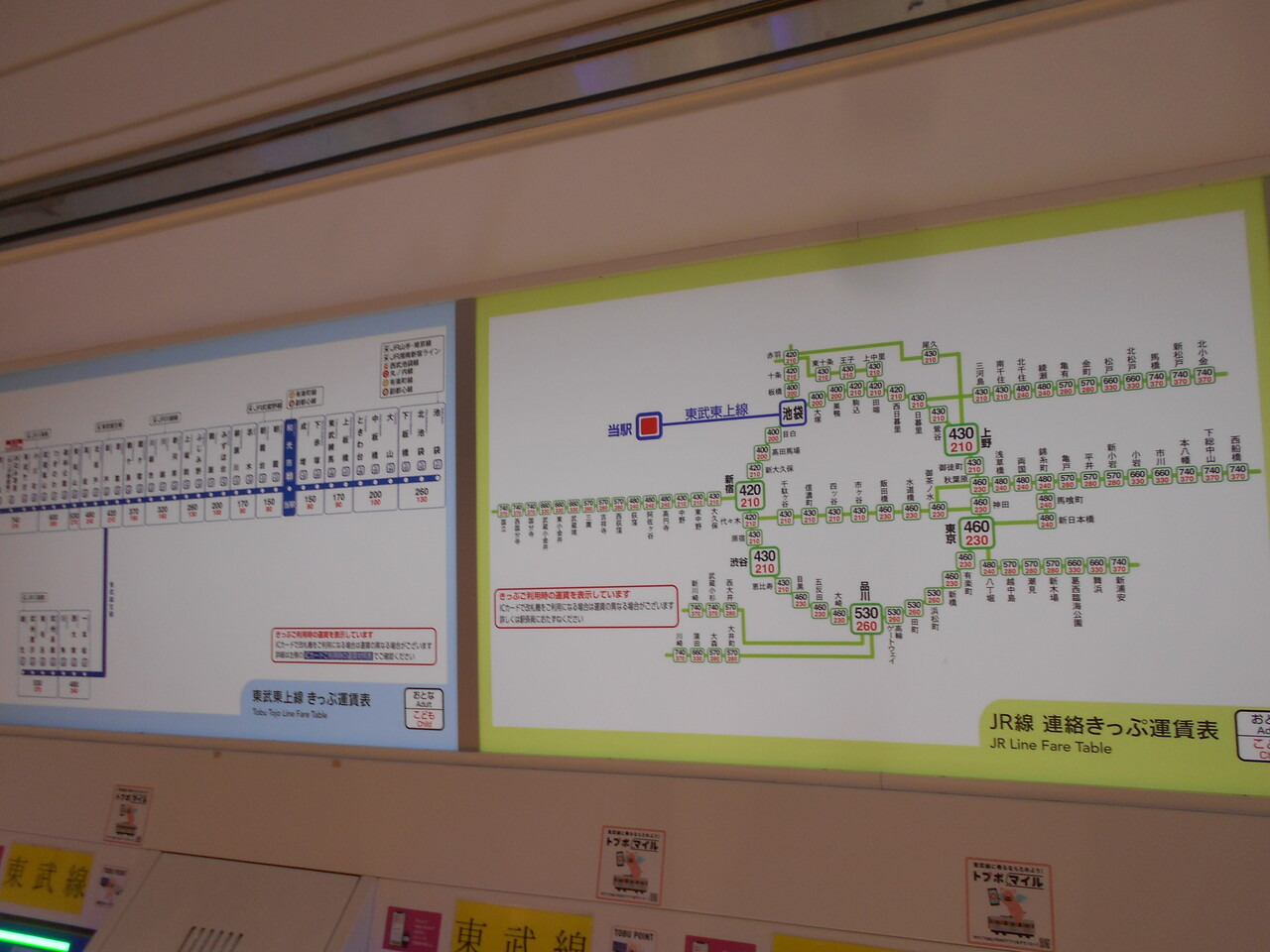 余談ですが東武線のJR線連絡きっぷ運賃表です。池袋駅乗換の運賃となっています。これによれば東上線池袋駅乗換で渋谷までだと430円、東京メトロだと直通で290円と断然格安になっていて、副都心線開業後はだいぶ利用が移転したのかも知れません。また、初乗り運賃が170円と割高なイメージが付きまとう東京メトロですが、池袋までの運賃は実は東京メトロの方が安かったりします(東京メトロ:242円、東武:254円)。