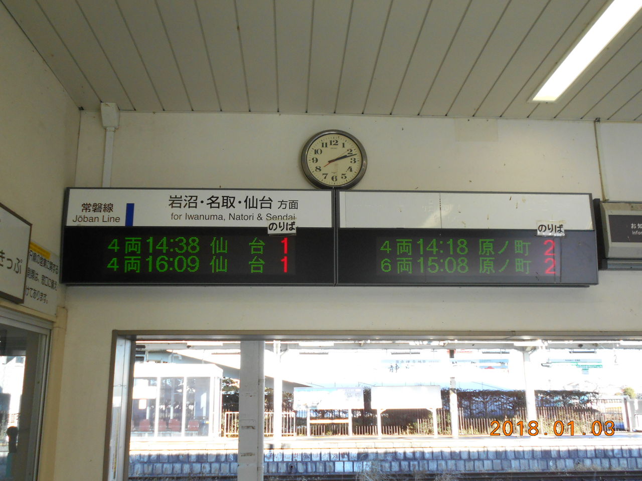 改札頭上の発車案内には仙台方面にのみ文字が振られていて、右側の原ノ町方面行きは真っ白なまま(2018年1月現在)。