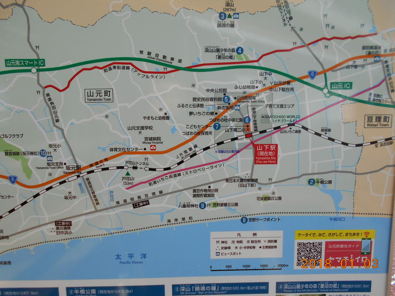 広域図を見ると現在の過去の常磐線の位置関係がご理解頂け易いかなと。現在の当駅の位置から海側へ視線を下ろすと「東日本大震災慰霊碑(旧山下駅)」の文字が確認できます。ここが旧来の山下駅の位置になります。