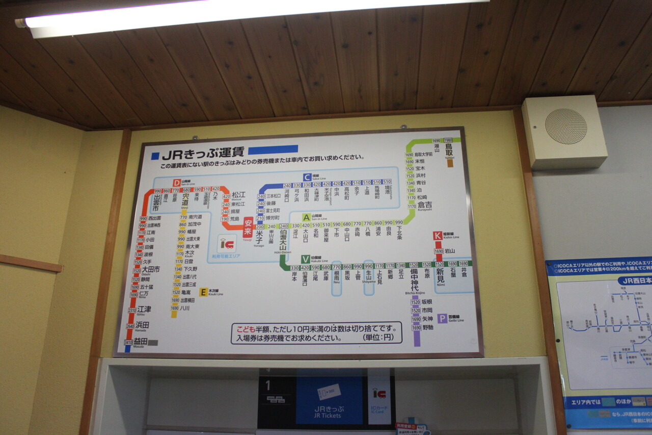 当駅の運賃表です。運賃表の下にある券売機は1,690円区間と鳥取・江津・浜田・益田の各駅までの乗車券発売に対応しているようです。
