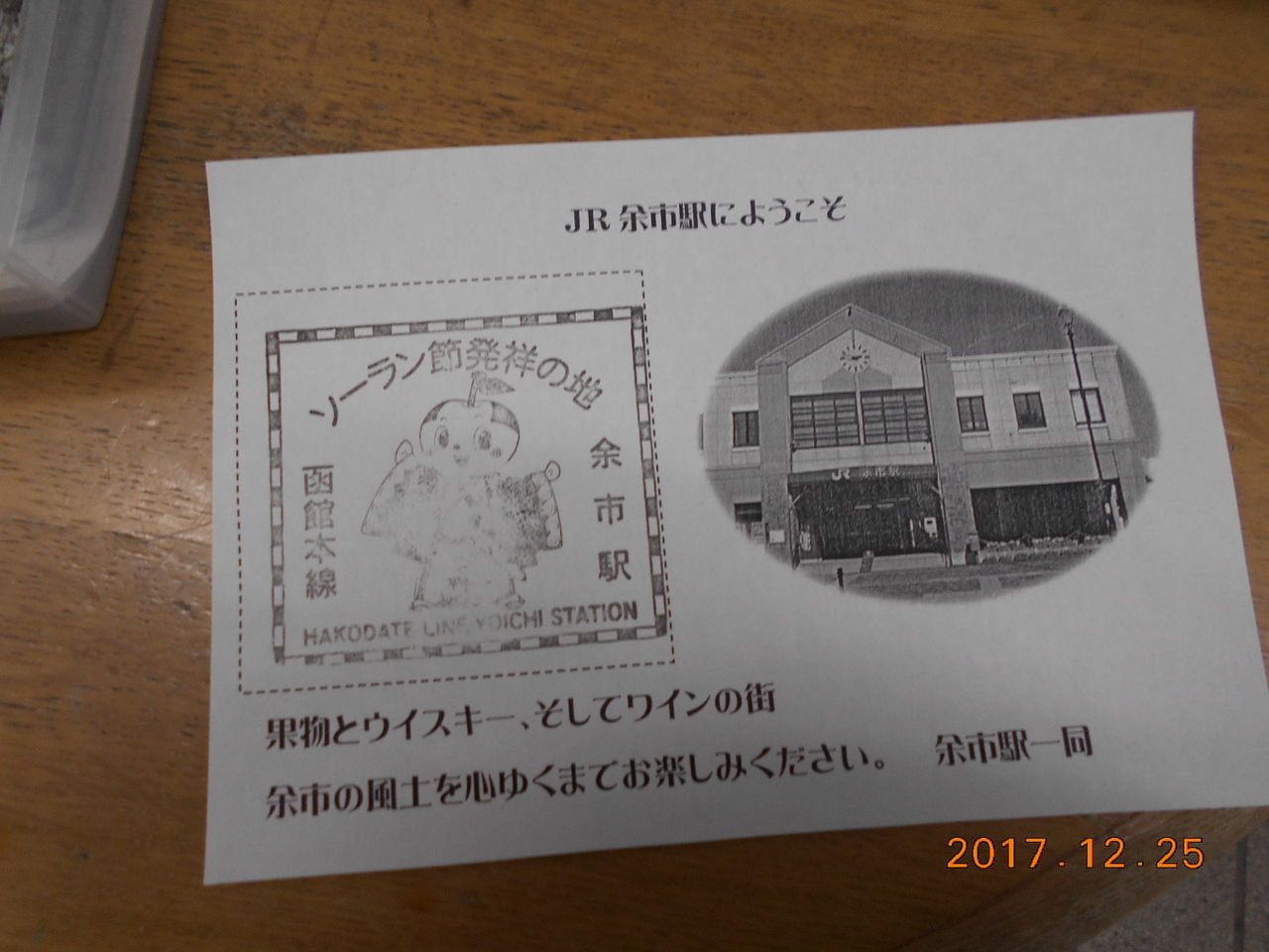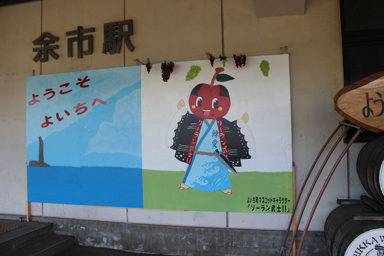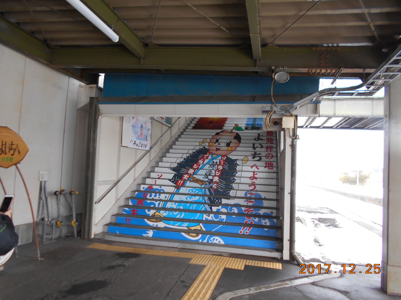 そのソーラン武士さんは会談にしっかりと描かれていますね。「よいちへようこそ」と書かれていますが、この階段は小樽・札幌方面からのお客さんは降りてくるんですけどねえ。