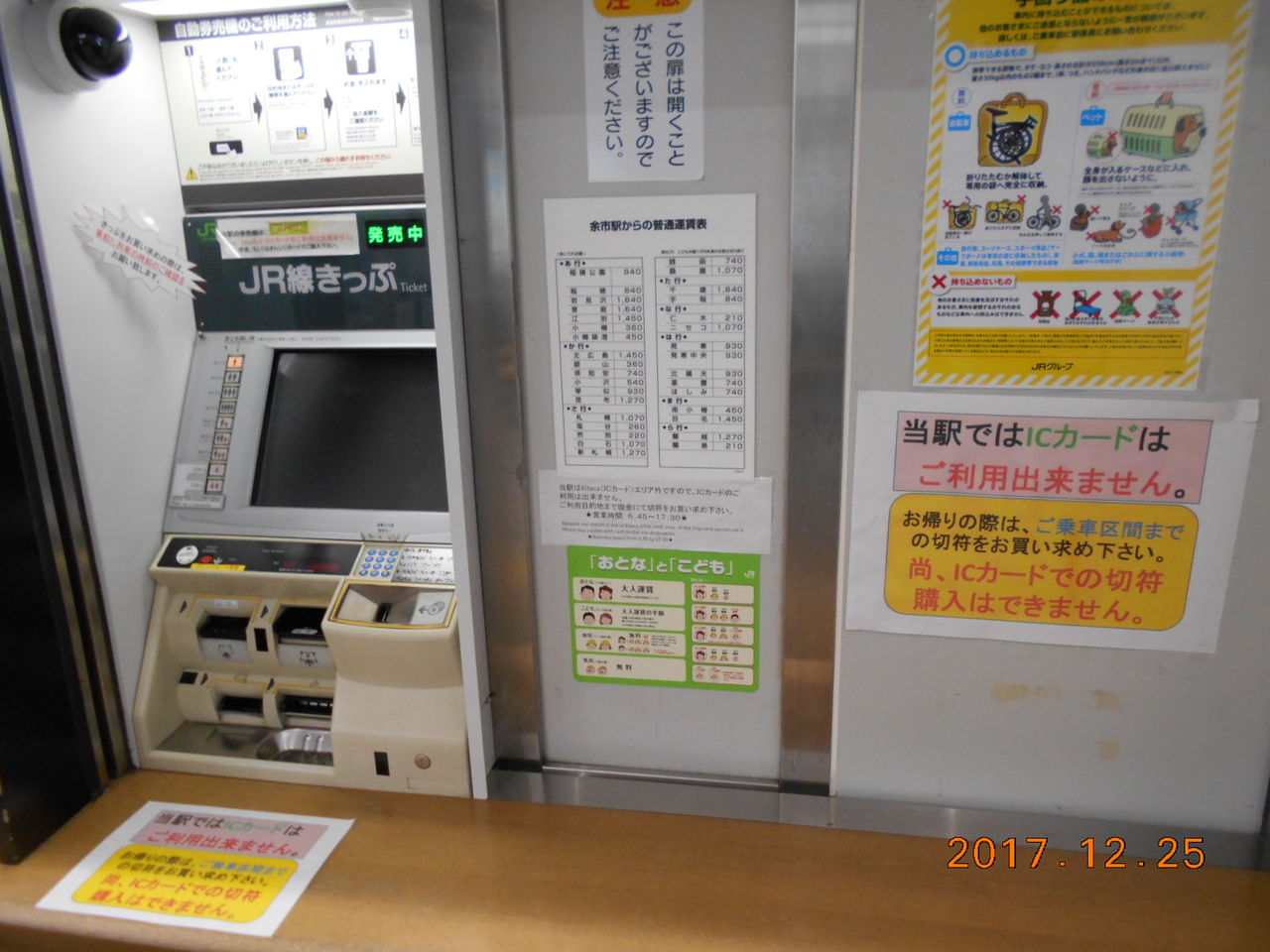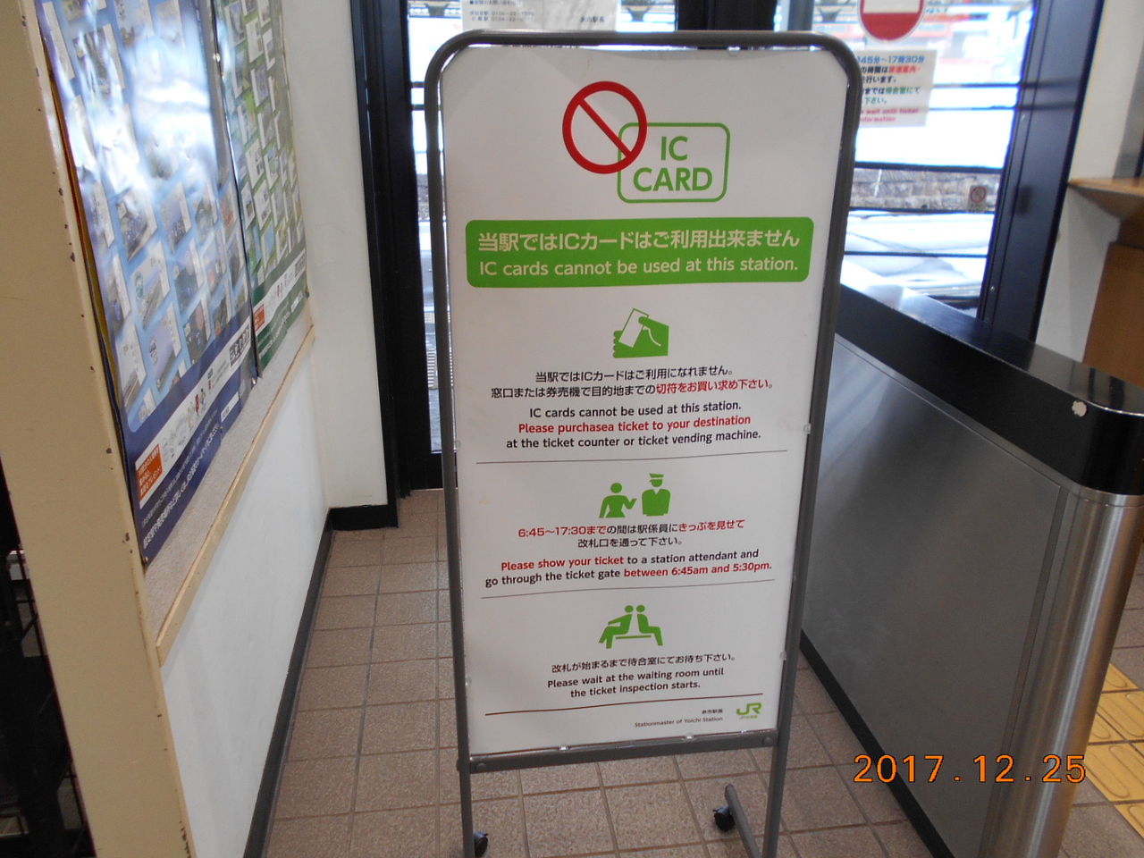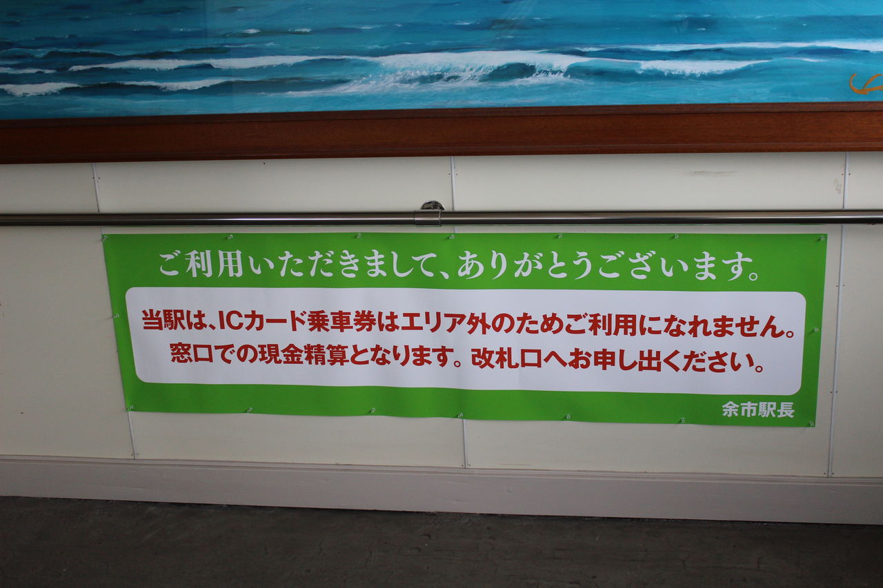 鉄道利用上の注意事項を示す看板にも一番大きくICカードが使えない旨が記載されています。ちなみに当駅付近から発着している中央バスの札幌~倶知安線はKitacaを含むICカードが使えますので、現金の手持ちが無くどうしてもICカードの残額で札幌~倶知安間を行き来しなければならないという方はバスの利用をオススメします(そんな人、おるんか???)。