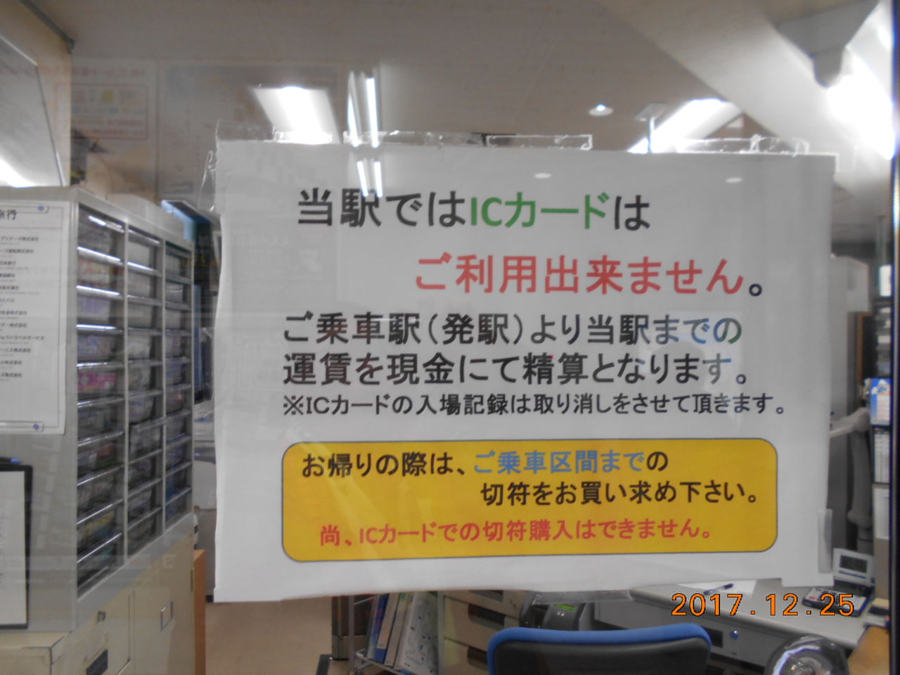 改札窓口内にはICカード処理用のパソコンとリーダ/ライタが設置されては居ますが、カードの残高及び入場記録確認と強制出場を書き込む機能しか使えないように細工が施されているようです。カード残高での不足分支払いには対応していませんが、Kitacaエリアから程近く行楽利用が多い当駅ぐらいICカードエリアに組み込んじゃえばいいのにと思ってしまいますが、オトナの事情もあるのでしょう。