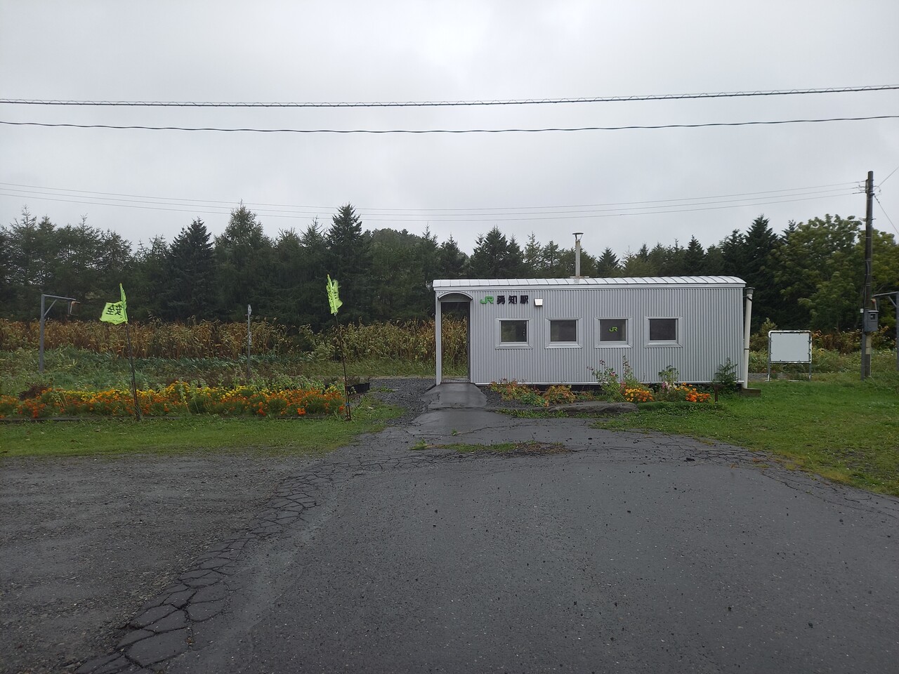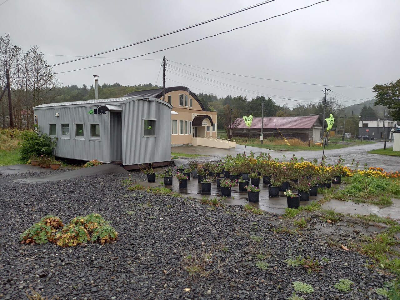 旧駅舎があった場所の基礎土台には地元の皆さんによる花壇がありました。駅付近には郵便局・警察官駐在所・Aコープ(販売所)・商店(軽食程度なら入手可能)・給油所などが点在していて、市営病院の診療所まであるなど、まとまった集落であると見受けられます。